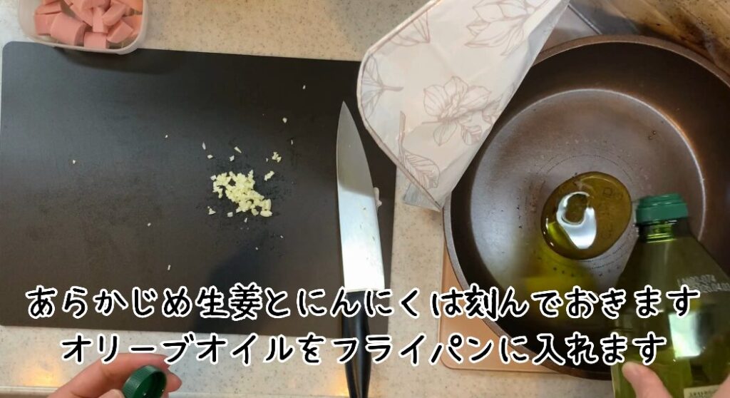 ① 生姜・にんにくを刻み、熱する前のフライパンに入れます。